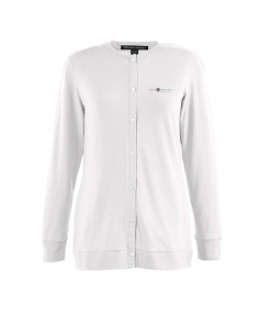5 oz., 58% cotton, 39% modal, 3% spandex jersey; Soft modal blend drapes without clinging; Dyed-to-match grosgrain ribbon accents placket; Dura-Pearl buttons ideally spaced to avoid unflattering gaps; Banded rib knit cuffs and bottom hem; Longer 27" length (size medium) is ideal for wearing open or closed